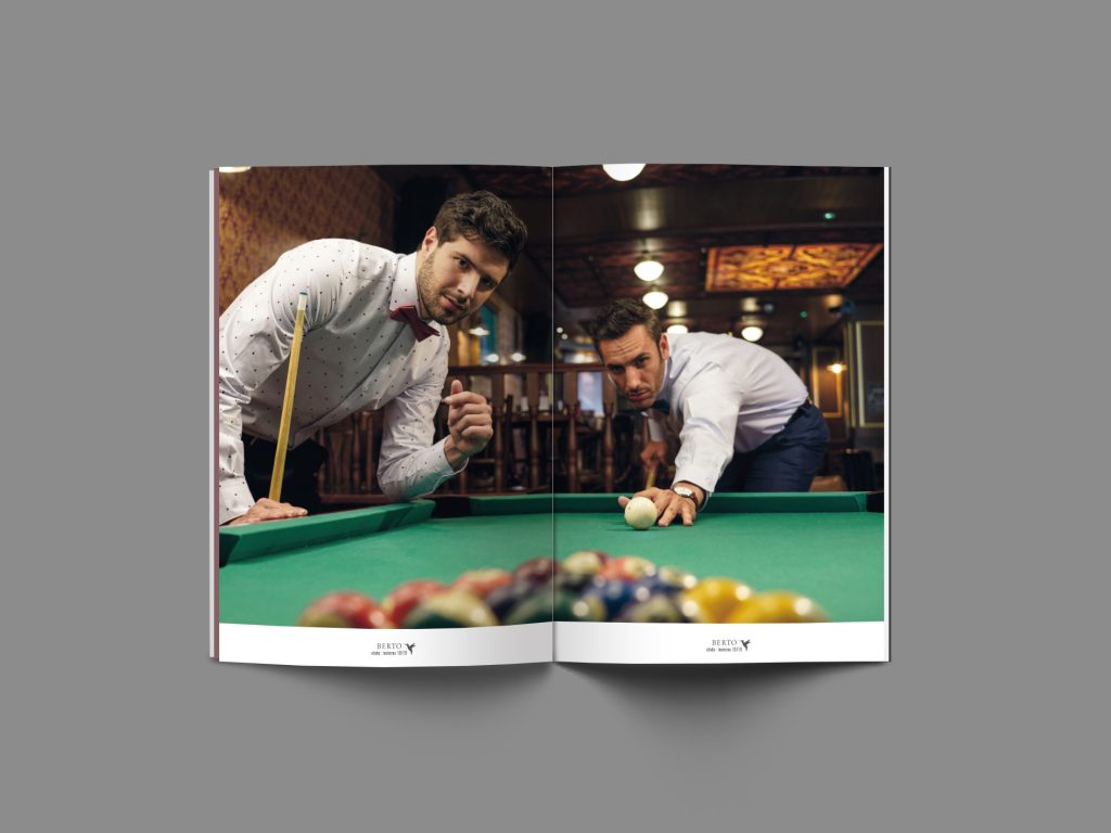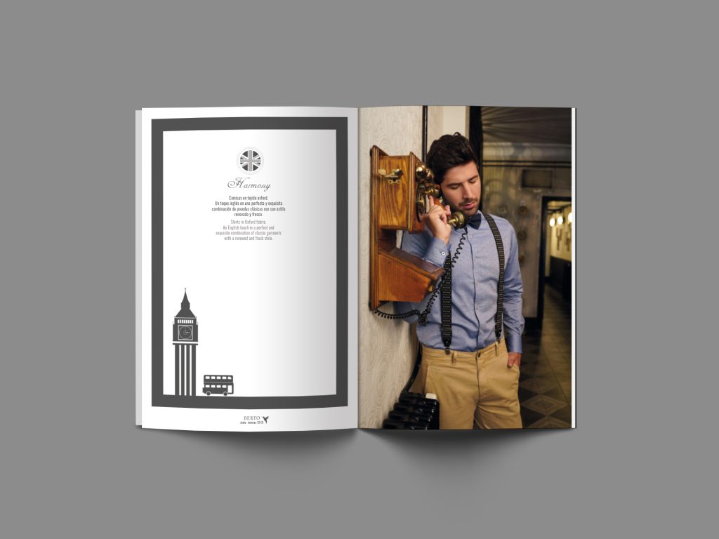 Berto Maquetación del catálogo de moda masculina Berto: editorial fotográfico con identidad visual oscura y elegante, presentando las colecciones por líneas de producto